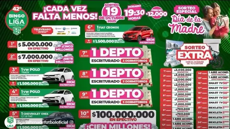De esta manera, con un sorteo especial llega el 42 Bingo de la Liga Salteña de Fútbol para acompañar esta hermosa jornada con millonarios premios a repartir, entre ellos 3 departamentos escriturados, vehículos, electrodomésticos y nada menos que millones de pesos en efectivo.