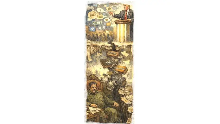 Del otro lado, Trump encarna el Primer Magistrado de Alejo Carpentier en El recurso del método. Es el tirano del espectáculo, el que utiliza la hipérbole y la puesta en escena para camuflar el desmantelamiento de las instituciones. Mientras Maduro se apoya en la mística desgastada del heredero del poder, Trump se erige como el dueño absoluto del verbo al estilo de Augusto Roa Bastos en Yo el Supremo. Trump entiende, como el doctor Francia de Roa Bastos, que quien dicta el relato, dicta la realidad; no necesita censurar libros si puede inundar la plaza pública con una polifonía de mentiras que vuelven la verdad algo inalcanzable. "Yo no escribo la historia. La hago. Puedo rehacerla según mi voluntad, ajustando, reforzando, enriqueciendo su sentido y verdad", clamaba el Doctor Francia.