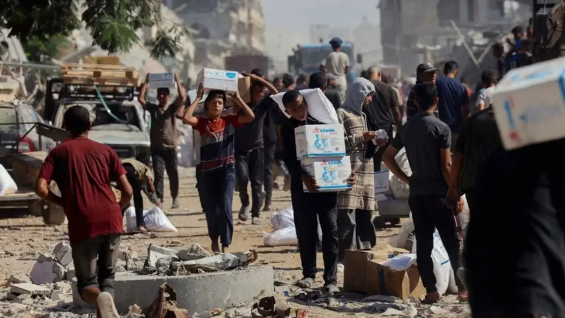 Los palestinos recogen la ayuda de los camiones que circulan por Gaza