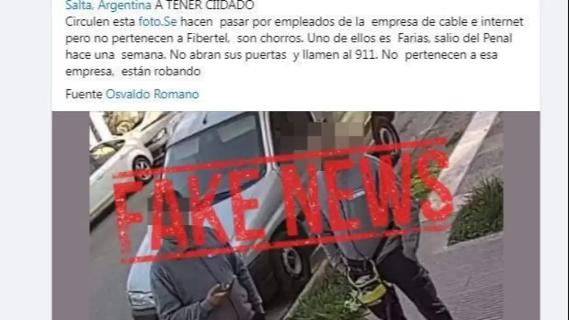 La difusión de información falsa y sin freno alcanza niveles alarmantes. Sobre todo cuando nadie chequea la información, y la dan como real, generando un clima de sugestión y tensión entre los involucrados en este tipo de fake news. Desde este viernes un mensaje que circuló rápidamente en redes sociales, especialmente en cientos de grupos de WhatsApp, señalaba que dos hombres, supuestamente trabajadores de Fibertel, intentaron ingresar a una vivienda.
