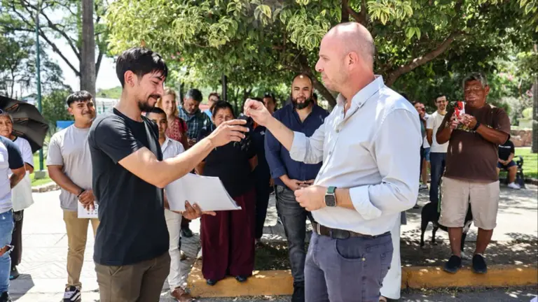 En el acto de entrega también participaron la diputada nacional Pamela Calletti, el senador Gonzalo Caro, el diputado Carlos Jorge, funcionarios municipales, trabajadores del área de Tierras y Bienes del Estado y familias beneficiadas.