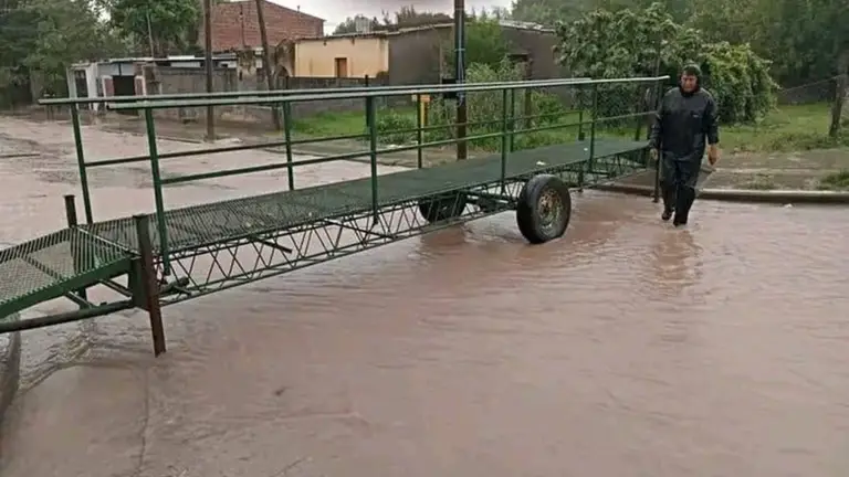Hace más de una década, ante la ausencia total de respuestas estructurales, se creó en La Merced un puente rodante peatonal como solución de emergencia para que los vecinos pudieran cruzar calles completamente anegadas, con correntadas caudalosas que parecen un río.