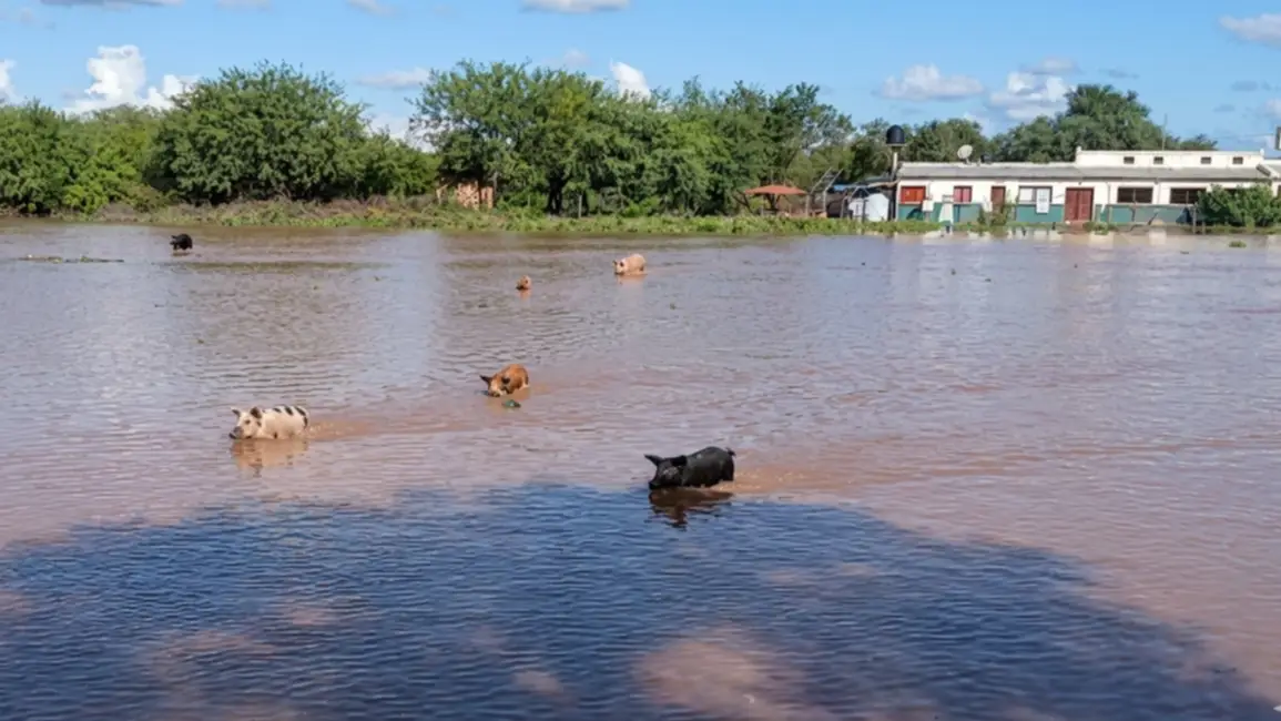 En un establecimiento rural ubicado sobre la ruta provincial 13, una familia de chanchitos intenta sobrevivir cruzando una laguna formada por el avance del agua. Detrás de la escena, se puede observar la escuela del paraje Agua Muerta, rodeada por la inundación.