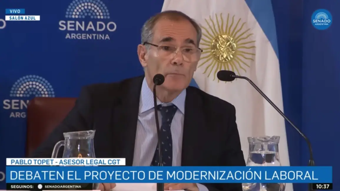 En la segunda jornada de audiencias de las comisiones de Trabajo y Presupuesto del Senado, presidida por la senadora Patricia Bullrich, el asesor legal de la CGT, Pablo Topet, presentó una exposición detallada y crítica al proyecto de reforma laboral impulsado por el Ejecutivo. Durante su intervención, Topet desglosó los puntos que considera regresivos y constitucionalmente cuestionables, dejando en claro su firme oposición a las propuestas en materia de derechos laborales y sindicales.