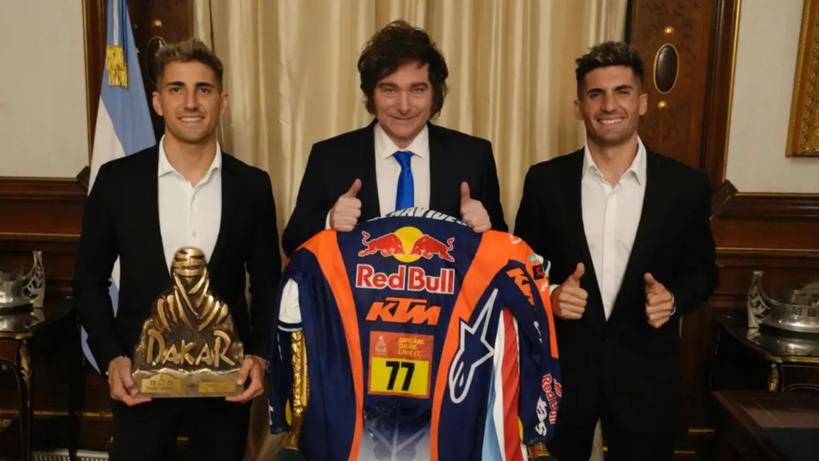 El presidente Javier Milei recibió este martes al mediodía en la Casa Rosada a los hermanos salteños Luciano Benavides y Kevin Benavides, protagonistas argentinos del Rally Dakar 2026. El encuentro formó parte de la agenda oficial del Gobierno y tuvo como eje el reconocimiento a sus actuaciones en la competencia disputada en Arabia Saudita.