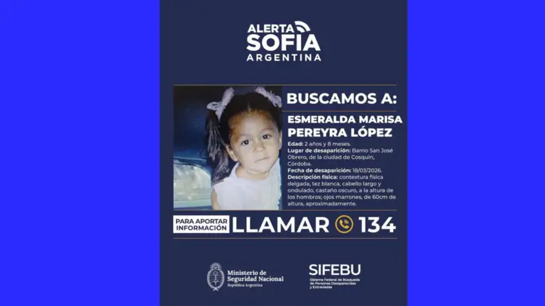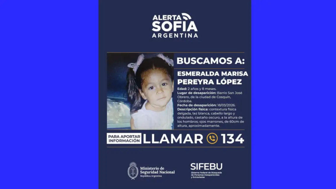 El miércoles 18 de marzo de 2026 fue la última vez que Esmeralda Pereyra López de 2 años fue vista. La desaparición de la nena alerta a toda la comunidad y las autoridades desplegaron un operativo de búsqueda en la provincia de Córdoba.