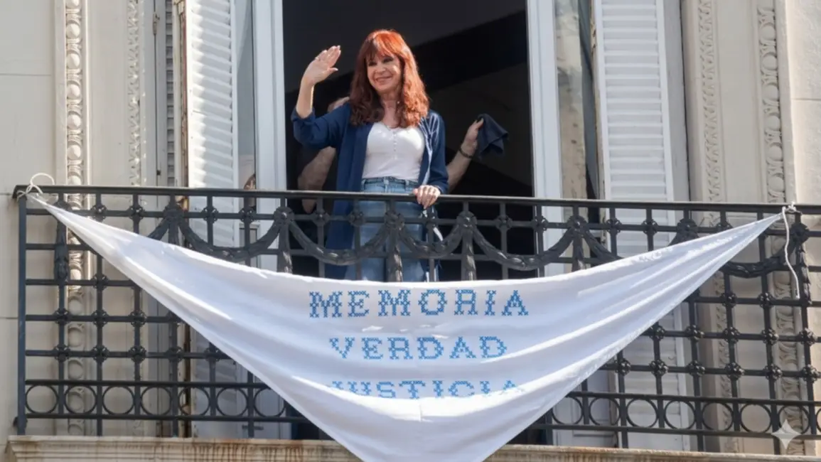 La ex presidenta Cristina Fernández de Kirchner puso este martes una bandera en el balcón de su departamento al cumplirse el 50 aniversario de la dictadura militar y saludó a los militantes de la agrupación La Cámpora que pasaron por su domicilio para pedir su libertad, previo a concurrir a la Plaza de Mayo.