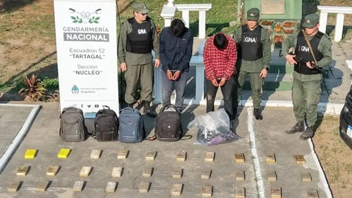 Dos de los traficantes no pudieron huir. Tras aprehenderlos, les hallaron un total de cuatro mochilas. Los funcionarios abrieron las mismas y extrajeron de su interior 53 paquetes rectangulares con características similares a las utilizadas para el traslado de estupefacientes. Luego llegaron refuerzos a la zona.