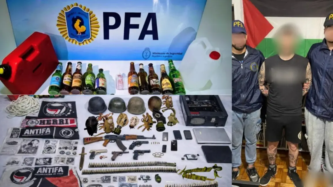 Además, los uniformados secuestraron cinturones con municiones de grueso calibre, dos cuchillos largos, cinco teléfonos celulares, notebooks, elementos de tecnología y hackeó, varias botellas de vidrio, sogas, artefactos que serían útiles para la fabricación de cócteles molotov, múltiples banderas con inscripciones antifascistas, doce pines ilustrados con amenazas contra el presidente Javier Milei y otros funcionarios, y la bandera de Palestina.