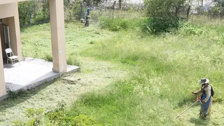 Un trabajador cortando el pasto en una escuela.